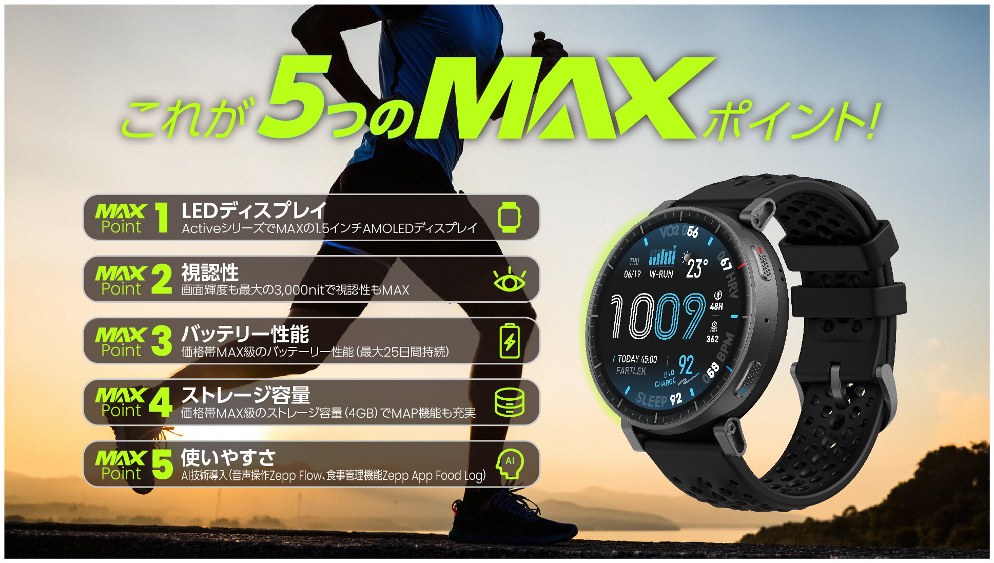 Amazfitのスマートウォッチとしては中価格帯のモデルで「Max」をコンセプトに開発・展開されます。