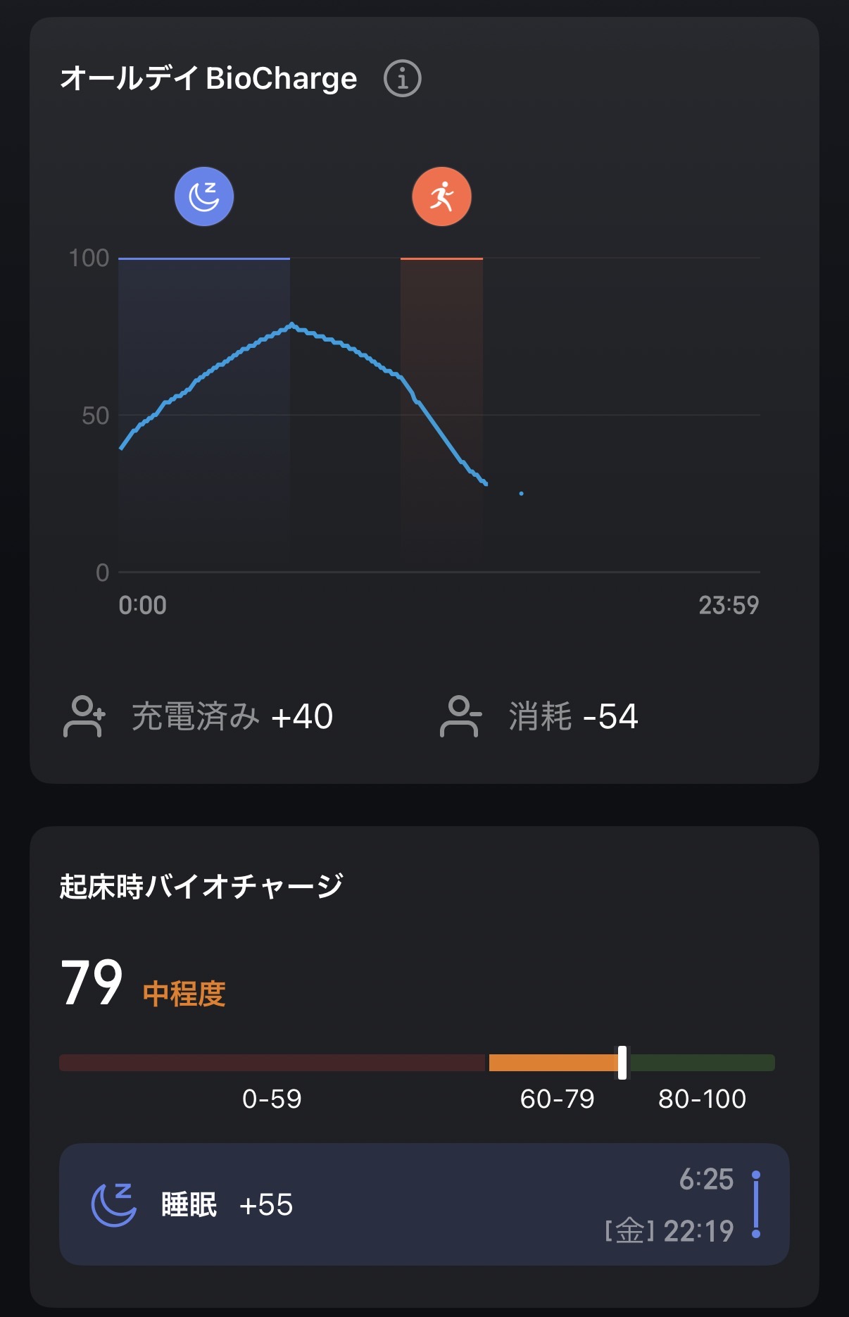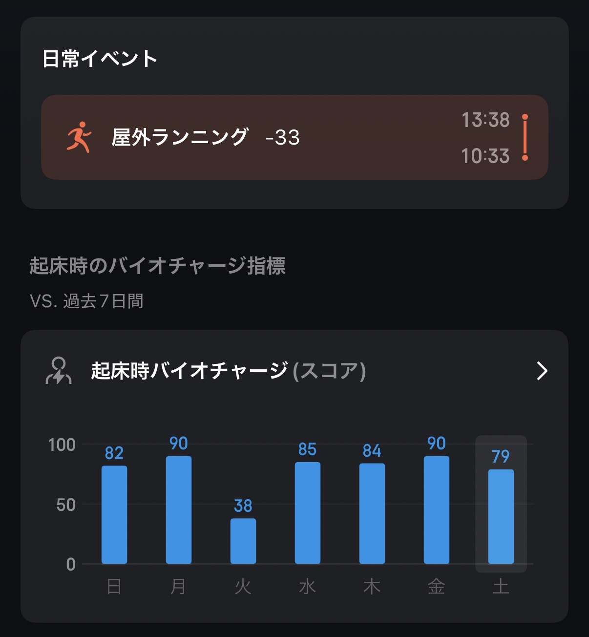 当方の環境では約1時間のワークアウトで4%程度の消費。ワークアウトを含めた24時間で約6、7%程度の減りでした。またランニングをしなかった日はわずか4%程度しか減りませんでした。