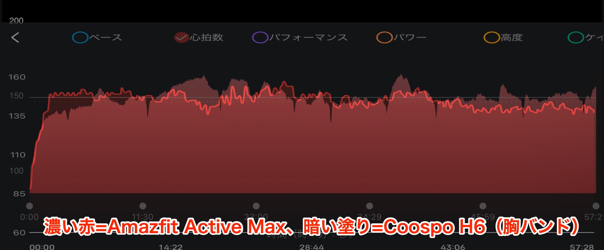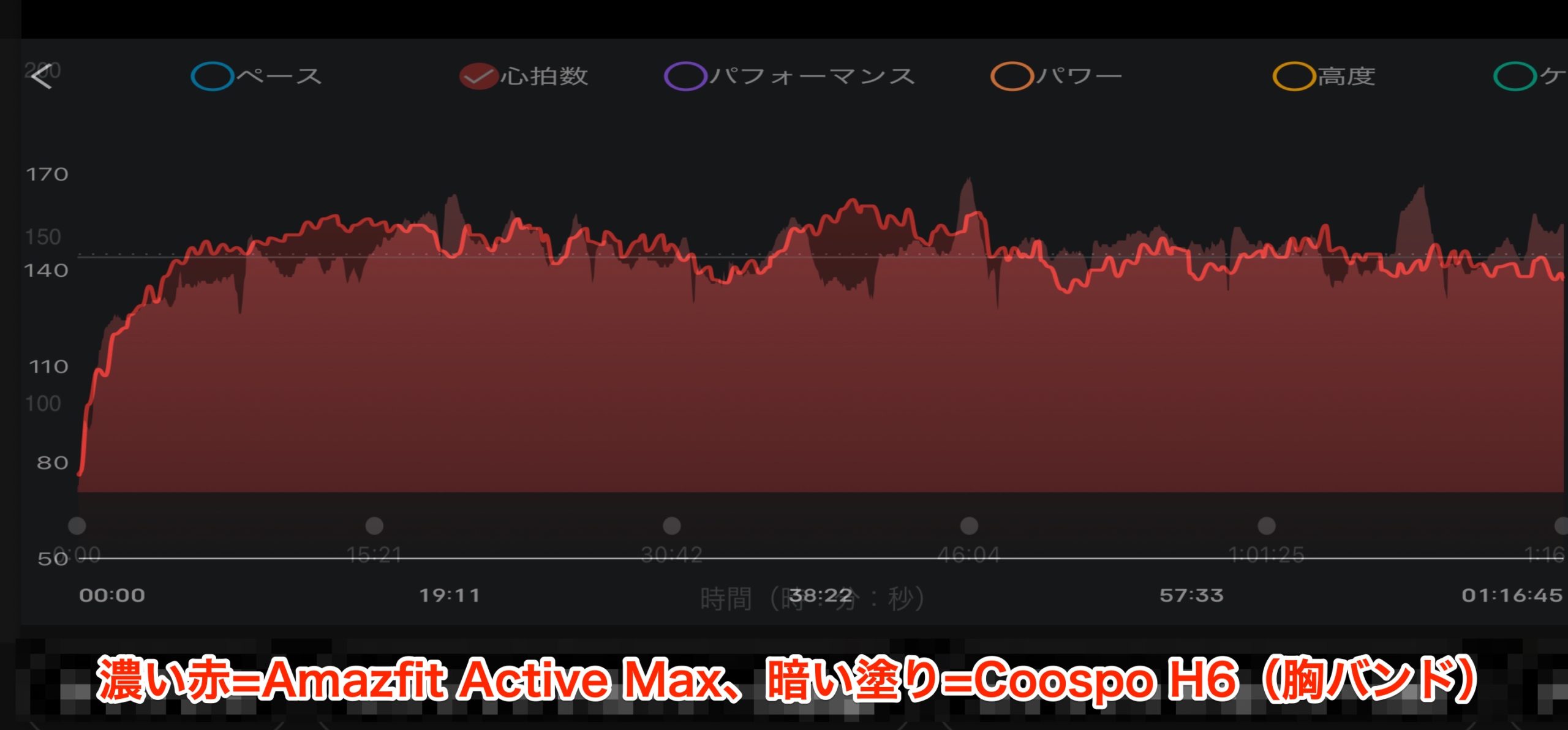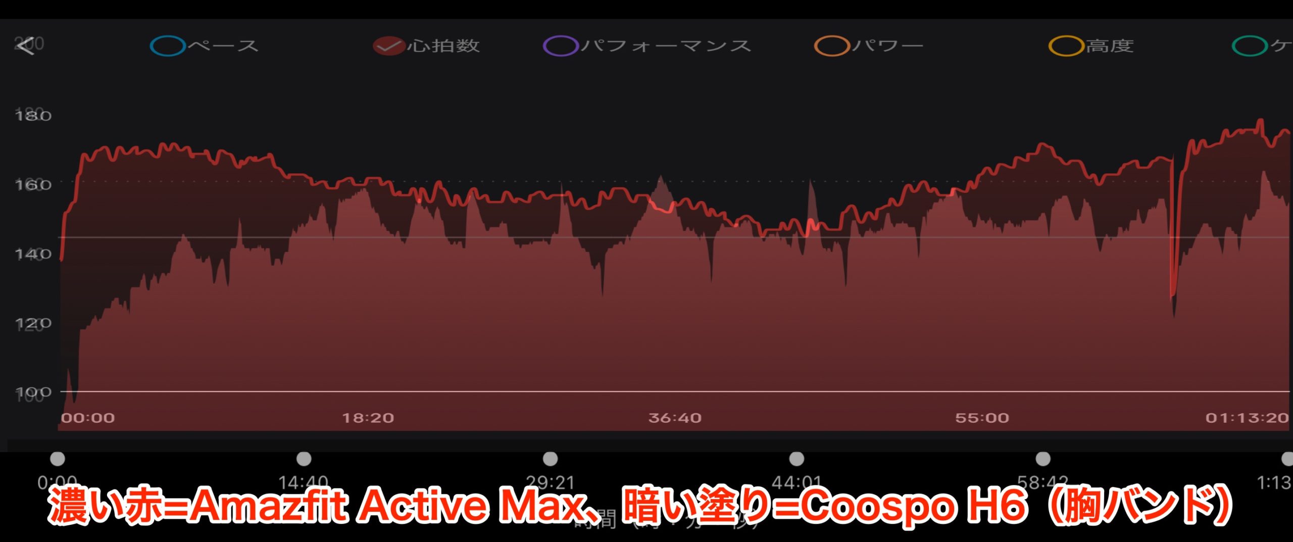 この日はスタートから意識的に心拍を上げて12km弱を一気に走り切りましたが、またも2つのグラフはほとんど一致しませんでした。この日は冒頭以外、Amazfit Active Maxの数値が胸センサーを終始下回っていました。